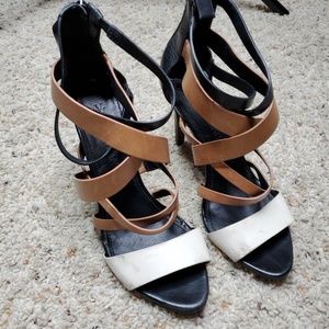 Hinda strappy sandals. Has visible signs of wear. White straps have some scratches/scuffs on soles.