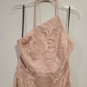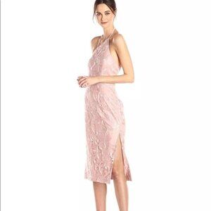 Vera Wang Asymmetric Sequin Lace Blush Midi Dress. Clear sequins add just a hint of shimmer to a classic midi cocktail dress made modern thanks to a captivating asymmetric halter neckline. It’s in excellent preowned condition.