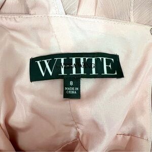 White by Vera Wang. Sleeveless Blush Pale Petal Pink V-neck wrapped bodice gown is timeless and romantic. Perfect for your wedding party, bridesmaids, prom or formal evening events. Elegant satin belt. Long, soft chiffon skirt features cascading bias cut ruffles. Gently worn, with a few minor snags / blemishes but overall very good condition. Fully lined. Back zipper. Tagged a size 8 but runs slightly small or may have been altered. See flat measurements below.