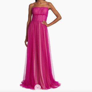 Tulle Fuchsia gown from Vera Wang. Size 10. Pleated bodice and trailing cape back. Never worn, tags still on it. Adjustable straps, but one strap is broken.