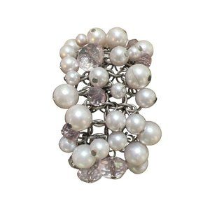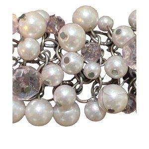 Vera Wang Cha-Cha Faux Pearl Bracelet -- 10". This bracelet is filled to the brim with white faux pearls, pale pink acrylic faceted beads (there are larger and smaller beads of each), lobster claw clasp, and silver-tone metal. Measurements: Length: (Pearl & Crystal Section): 6"; Extender: 3.5".
