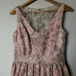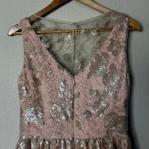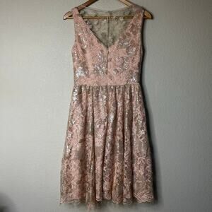 Vera Wang Dress Lace Elusion Rose Gold Silver Sequins Cocktail Formal Sleeveless Fit & Flare V-Neck Back Zip Closure with Keyhole Button