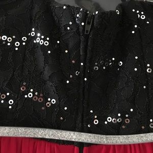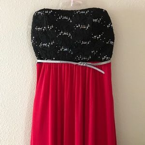 Brand new with tags. Beautiful elegant yet simple gown. Red bodice with black sequence glittery showy top. Fully lined. Zip closure in the back. Strapless tube top dress.