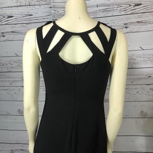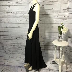 Stunning sleeveless black gown for any formal event. Neckline adorned with cut outs to show off your shoulders. Invisible zipper with hook and eye closure. Slight flair to the bottom. Partially lined to about skirt length . Excellent pre-owned condition.