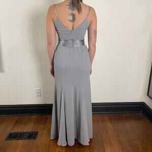 Beautiful light gray Vera Wang dress was worn once for a wedding. Tailored to fit snug on the waist and had a front slit added for more movement. Doubled lined and no stains.
