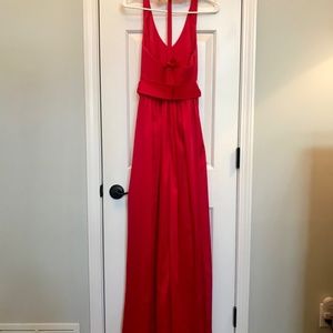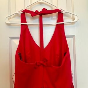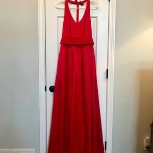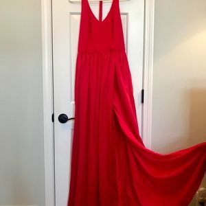 Red satin gown in perfect condon, leg slit, bow details, removable sash belt, fully lined, back zipper