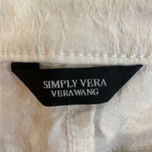 Simply Vera by Vera Wang white denim jeans size 10. These jeans are a slim cut jeans in white, the material is very unique. There is texture to the denim of a damask print that gives amazing details and texture. Very unique and designer. They have four functional pockets and a zipper fly