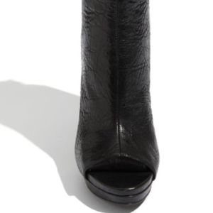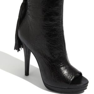Gently used in great condition. Some wear on inside section of heels, (last picture) not noticeable when wearing. Make a statement w/Long tasseled zipper pulls that swing from the back of a peep-toe bootie crafted from grained leather. Approx. 4 ½” covered heel and partially concealed 1 ¼” platform. (comparable to 3 ½” heel). Boot shaft approx. 6”high. Comes in original box w/shoe bag. SAD to let these go, I had serious health issues with my legs, can no longer wear heels. My loss your GAIN!!!