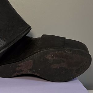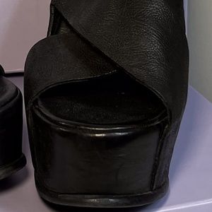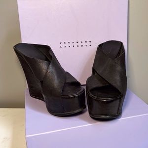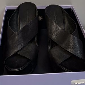 Vera Wang Black Leather Slides, size 9, barely worn. Soles of the shoes are the only place that shoe some wear. No scuffs, scratches or tears on the rest of the slides. Beautiful and stacked.