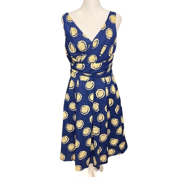 Vera Wang Lavender Label Polka Dot Wrap Dress V Neck Sleeveless Navy Gold Size 6