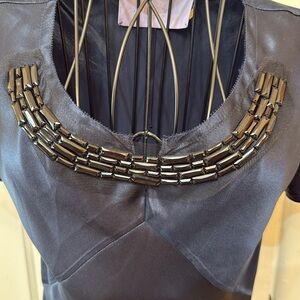 100% silk navy top with gem details around the neckline. Shirt is cut on the bias and in excellent condition.