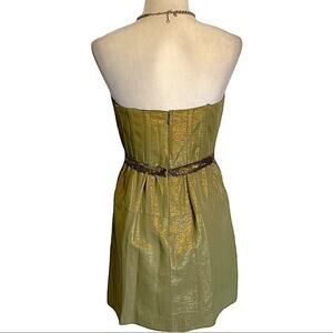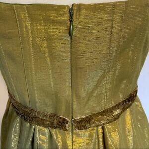 Shimmering green strapless cocktail dress top stitched detailing on the bodice and waist and a gold sequined attached belt.