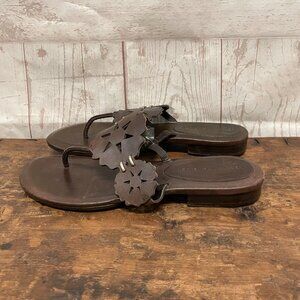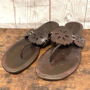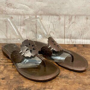 thong, slip on style, flower, laser cut, leather sole, uppers, slightly cushioned footbed, flats