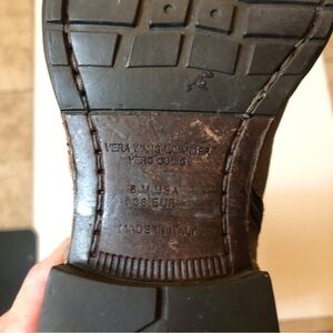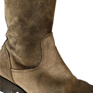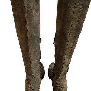 Gorgeous knee high distressed gray suede riding boots by designer Vera Wang “Lavender” label. They are in excellent condition with a few small marks, which I’ve tried to photograph in detail, on the boot shaft. The boots have a 1” heel, treaded rubber sole, inner shaft zipper, cute lace up accent on back ankle. The gray has a brownish/olive tone. The photos are a good reflection of the color. Wish they fit me because I LOVE them, and think you will too! Size 6M or 36 EUR