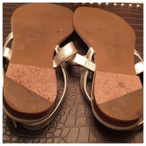 Silver-tone soft leather and buckle closure at straps. 1/2" wooden heel.