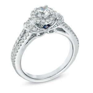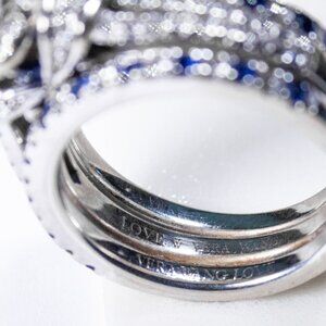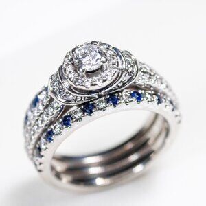 Vera Wang Love Collection Wedding Ring Set with two wedding bands. Diamond Collar Engagement Ring in 14K White Gold with blue sapphire. Two diamond and sapphire wedding bands. Great condition.