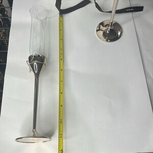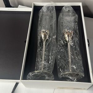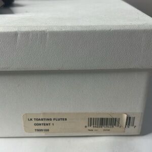 This is a beautiful Vera Wang New in Box LK 11” Pair of Toasting Flutes Crystal & Silvertone. Unused. Box has a some scuffs from storage. No chips no scratches.