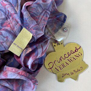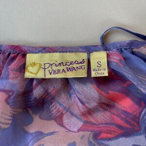 Vera Wang Princess Sheer Leaf Prints Tunic 3/4 Puff Sleeve Multicolor Size Small, Pleated round neck with Tie Neck and glitter accents. New With Tags originally at $44. Color may vary in pictures due to lighting. Approximate Measurements: