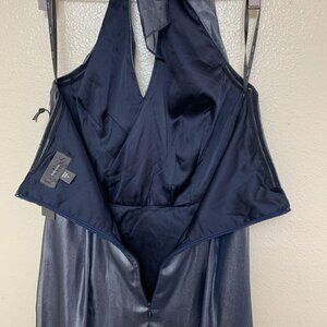 Vera Wang Satin Chiffon Halter V Neck Cocktail Dress Size 6 Navy Metallic