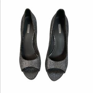Vera Wang Selima Silver Glitter Open Toe High Heel Platform Pumps. Features a wrapped platform and heel, peep toe, allover glitter leather construct, leather upper lining and sole. Light wear. Wear on bottom sole and a few rubs on glittery leather. All photos of actual item and show condition.