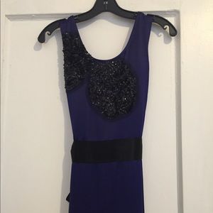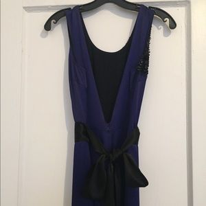 Vera Wang Sequin Evening Gown. This dress is a deep purple or navy, has a flattering v-shaped neckline in back, and has a silk tie at the waist. Good condition.