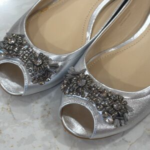 Size 7.5 Silver Bejeweled VERA WANG Ballet Flats that have never been worn, have a dust bag and are in near perfect condition. Smoke free home. Fast Shipper.