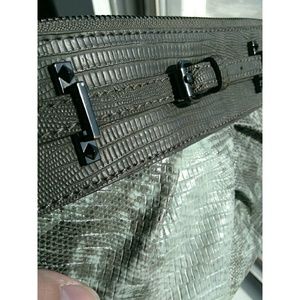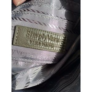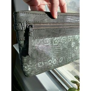 EUC Vera Wang turquoise and gray snakeskin wristlet. The only thing is that the wrist strap is missing (reflected in price). Otherwise, it's in great condition. There is a small tarnished spot on the hardware on the left side as shown in picture 7, which is hardly noticable unless looked at closely. The interior has the classic Simply Vera Wang print with a zipper pocket and card slots. Even without the wrist strap it would make a great wallet or catch all for your purchase.