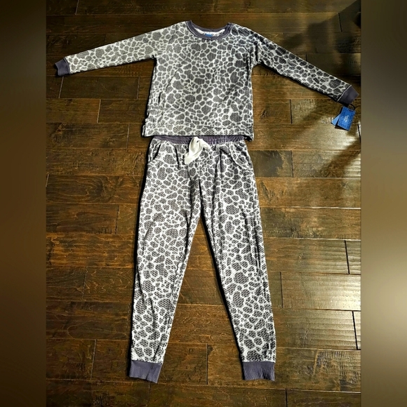 Brand new with tags 2-piece pajama set. Soft fleece gray and white pattern with white bow on pj pants. Very cute and cozy.