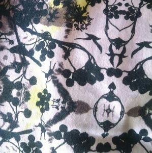 Tesselated black silhouettes of a park scene featuring birds, foliage, deer, and a balloon-holding girl are printed over neon yellow and warm gray-brown splashes to create an inkblot effect. Low rise with Vera Wang button details. From the Princess Vera Wang line.