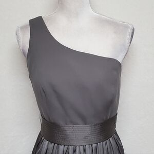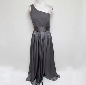 Vera Wang White Charcoal Satin Crepe One-Shoulder Belted Side Slit Formal Gown.