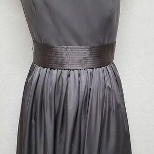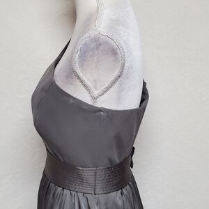 Vera Wang White Charcoal Satin Crepe One-Shoulder Belted Side Slit Formal Gown.