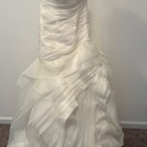This dress has been worn once with no alterations and fits to perfection size 0. Vera Wang did a bridal collection with Davids Bridal which had some beautiful dresses. Its in good condition and comes with an attachable belt.