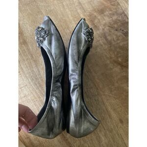 Pre-owned Vera Wang metallic silver ballet flats with peep toe and ornate beaded crystal embellishment at the front. Size 7M. Made with genuine leather soles (Vero Cuoio). Soft, flexible construction with gathered heel. Some light creasing and wear, mainly to the back and sides—please see all photos. Still elegant and wearable.