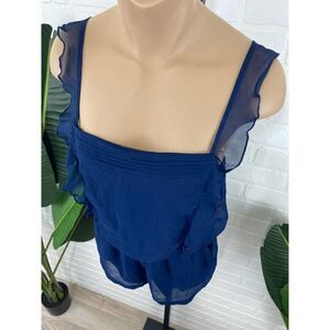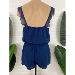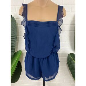 Princess Vera Wang blue flutter romper. Girls, but fits petite and/or small Women. Flutter sheer straps. Has pockets! Elastic waist. Straight neckline. Lightweight chiffon like material. Lined.