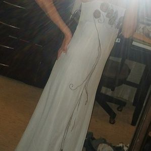 Vera wang long to the floor pastel green dress with tan/brown flower accent design on top.