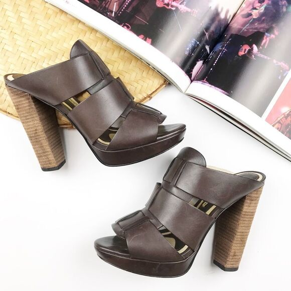 Size 7.5, in great used condition! Minor wear. Brown weaved leather with a 5 inch heel