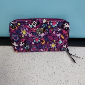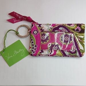 This Vera Bradley zip-around wallet wristlet features a colorful floral pattern in shades of purple, pink, green, yellow, and cream. Designed in Vera’s signature quilted cotton, it includes multiple card slots, an ID window, and a secure zip closure, all in one compact and travel-friendly design.