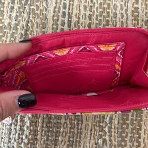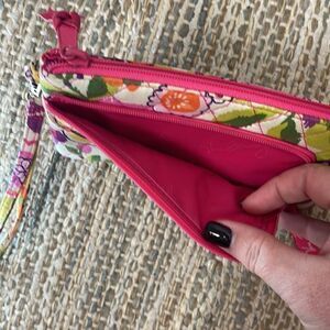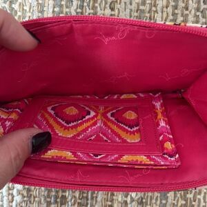 Vera Bradley Zip Zip Wristlet in the Clementine pattern, mostly orange and pink watercolor looking floral, some green and yellow. Outside expanding zip pocket, 4 card slots, ID slot, and a slot in between these inside expanding zip body. Good used condition, paint is worn on zipper tabs, stitching and inside fabric is unworn.