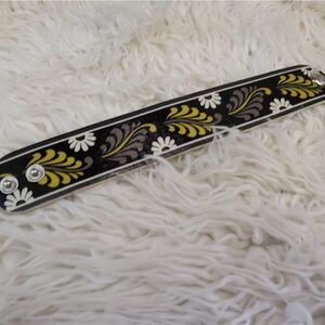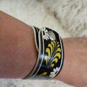 Excellent used condition, nearly new. Covered leather wrist band with the retured Baroque pattern. Standard 7½" bracelet with a double snap for adjust size.