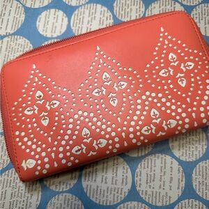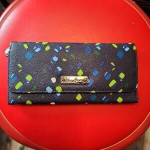 Interior has nine slip pockets, four bill pockets, an ID window, a zip pocket and an elastic farmer pocket.