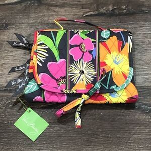 Love this Very Bradley pattern. It is bright and fun! This cosmetic case is new with tags and has never been used. There are three inside compartments. All measurements are shown in the pictures.