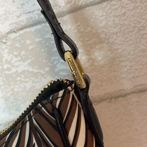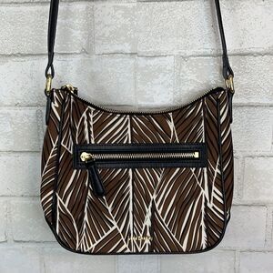 Body of bag is made of water repellant microfiber polyester, and the trim and strap are made of genuine leather. Zipper closure with gold tone hardware. Exterior front zip pocket, cotton lined interior with back-wall zip pocket and front wall slip pocket. Strap is made to adjust from crossbody to shoulder strap.