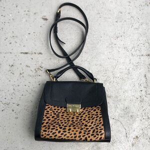 Black leather with cheetah pony hair, it’s in very good condition measures approximately 9 1/4 x 8 x 4 1/2, adjustable strap this bag is in new condition