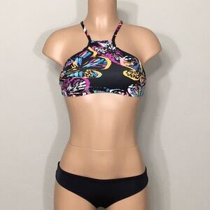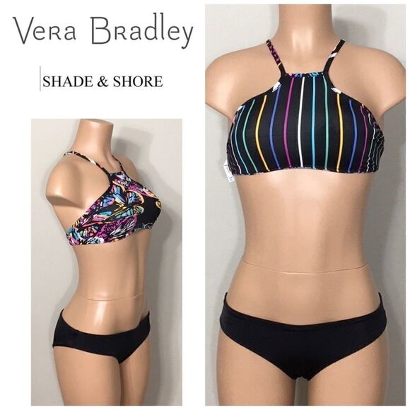 Vera Bradley reversible halter top. Bright floral pattern on one side and stripe pattern on the other. Ties to adjust. Adjustable straps. Soft removable pads. Mixed with Shade & Shore cheeky ruched bottoms. Fully lined with high quality fabric.
