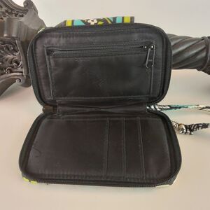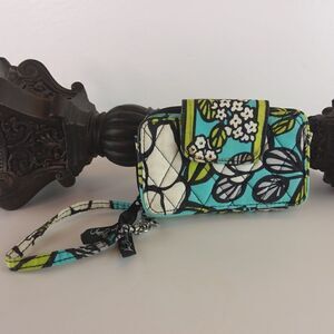 Vera Bradley printed wristlet wallet with outside ID holder, outside pocket with snap closure, zippered closure fold out pocket, with one inside zipper pocket, one open inside pocket, and three credit card pockets. Wristlet has some mouth staining, please refer to pictures.