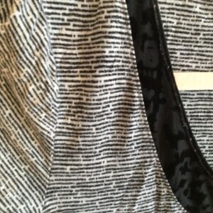 Simply Vera by Vera Wang brand women’s XS black and white tunic top, Long sleeve, rounded neckline with burn-out velvet on chiffon trim. Chiffon ruffle trim at hemline on this over-sized comfortable tunic top. Showing photos of front and back sides.