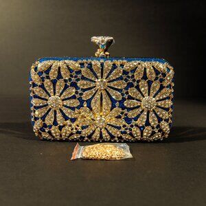 Add a touch of elegance to any evening with this Verano Hill Blue Crystal Floral Clutch. Designed with a deep sapphire-blue base and gold filigree detailing, this clutch shines with hundreds of hand-set crystals that catch every light. The diamond-cut clasp and detachable gold chain strap offer both luxury and versatility. Perfect for weddings, galas, or upscale events.
