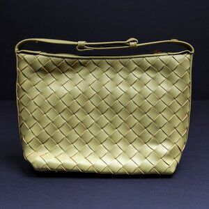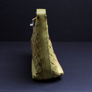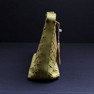 The Verano Hill Danielle Shoulder Bag in olive green features a woven basket-style exterior that combines classic and contemporary design. Crafted from smooth vegan leather with gold-tone hardware, it’s compact but structured, easily fitting essentials like a phone, wallet, and keys. The attached handle offers shoulder carry, while its unique texture and color make it a standout accessory.