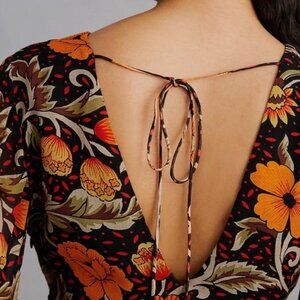 Sophisticated floral mini dress with wide sleeves and beaded fringe on the ends. Beautiful autumnal colors and overall dress has great movement and flare. A little open back with tie, and a zipper on the side. Boho-chic! (I'm a 2x and literally wore this once).