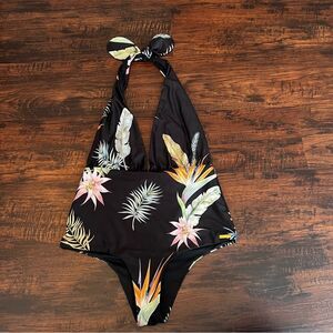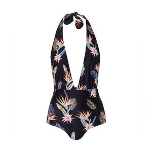 Luxury designer one-piece swimsuit by Verdelimon x Sandra Weil. Features a dramatic plunging neckline with adjustable halter tie, flattering ruched waist detail, and tropical floral print on sleek black background. Fully lined for comfort and support. Sustainable swimwear brand known for elegant, vacation-ready styles. Excellent pre-loved condition — no flaws noted.